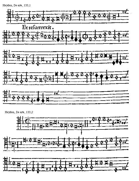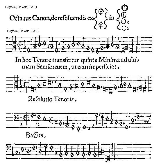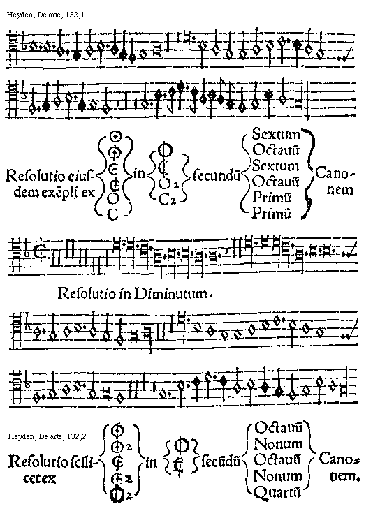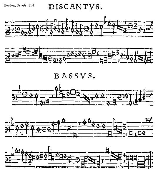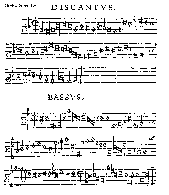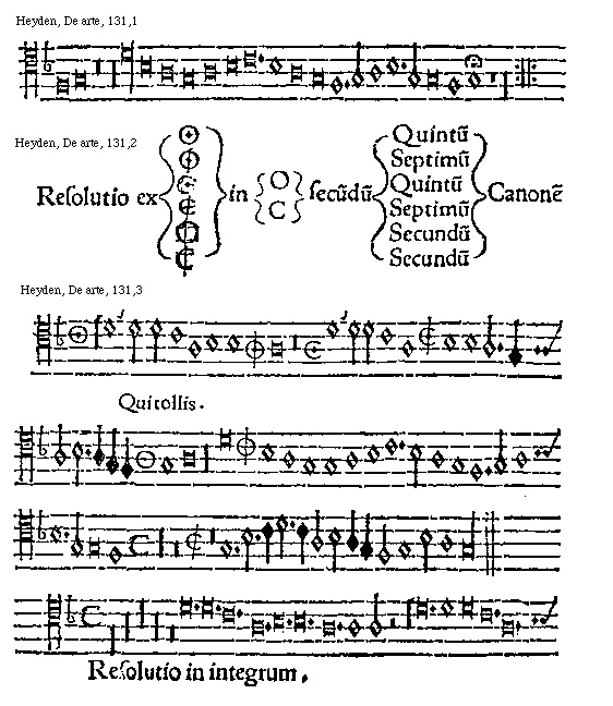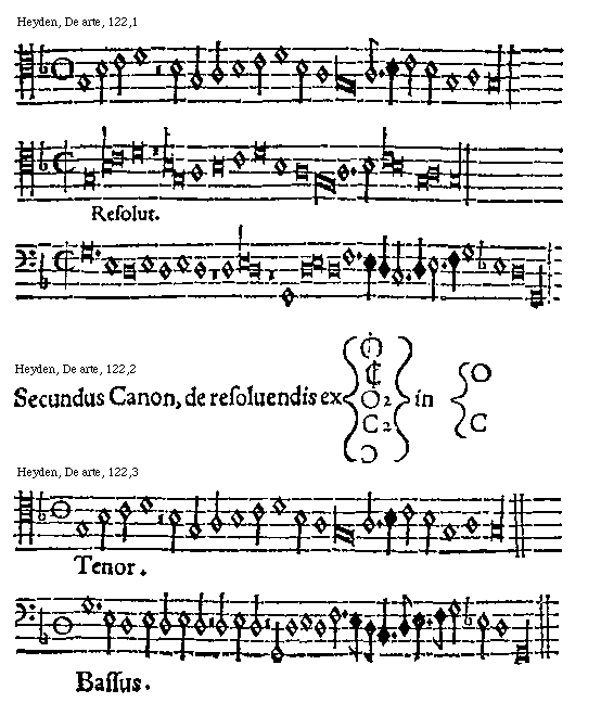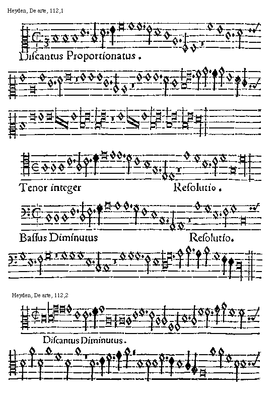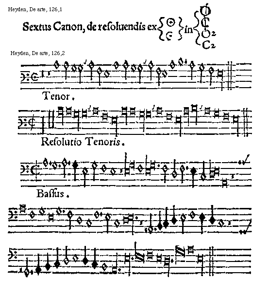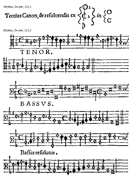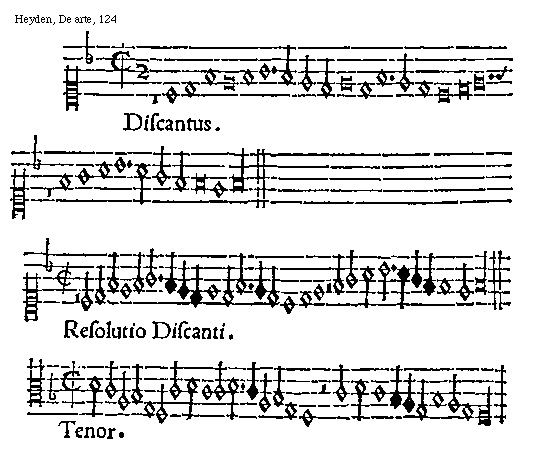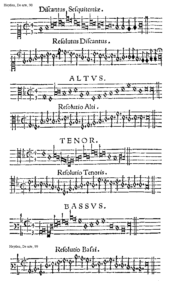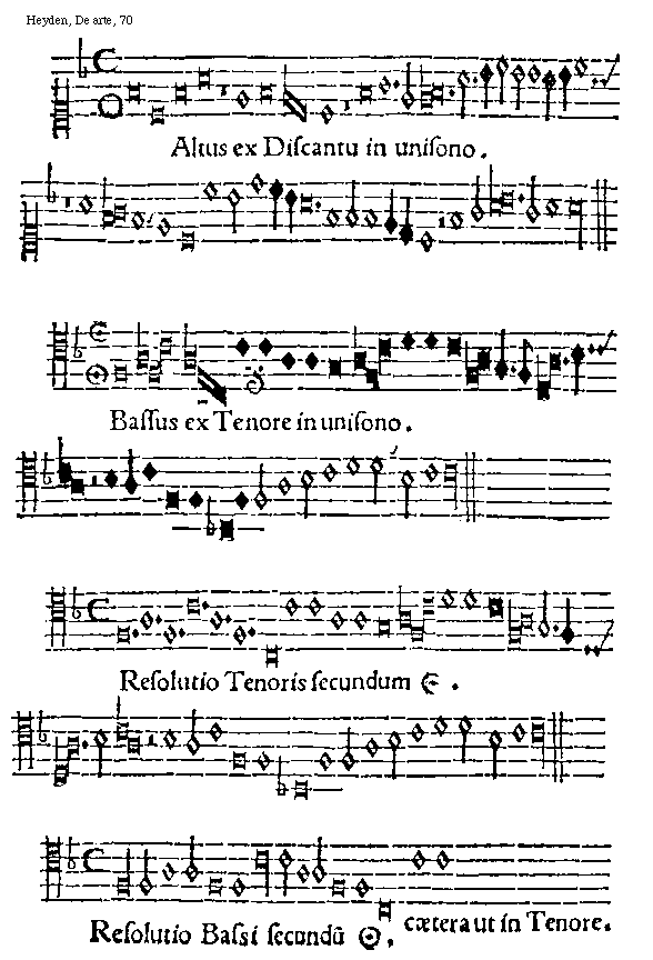 [70][Heyden, De arte, 70; text: Altus ex Discantu in unisono. Bassus ex Tenore in unisono. Resolutio Tenoris secundum, Resolutio Bassi secundum, caetera ut in Tenore.]