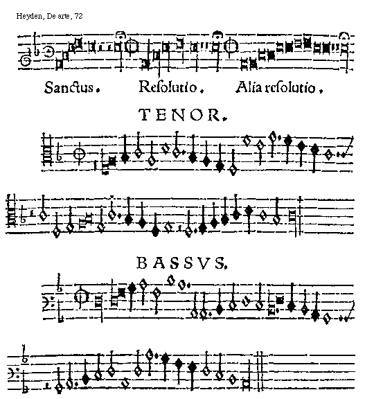 [72][Heyden, De arte, 72; text: Sanctus. Resolutio. Alia resolutio. TENOR. BASSVS]