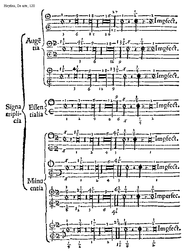 Est eas ternario numero ita censeri, ut quaeque maior proximam minorem ter in se cotineat. Hoc fit, si Maxima tribus Longis: Longa tribus Breuibus: Breuis tribus Semibreuibus; Semibreuis tribus Minimis ualet.