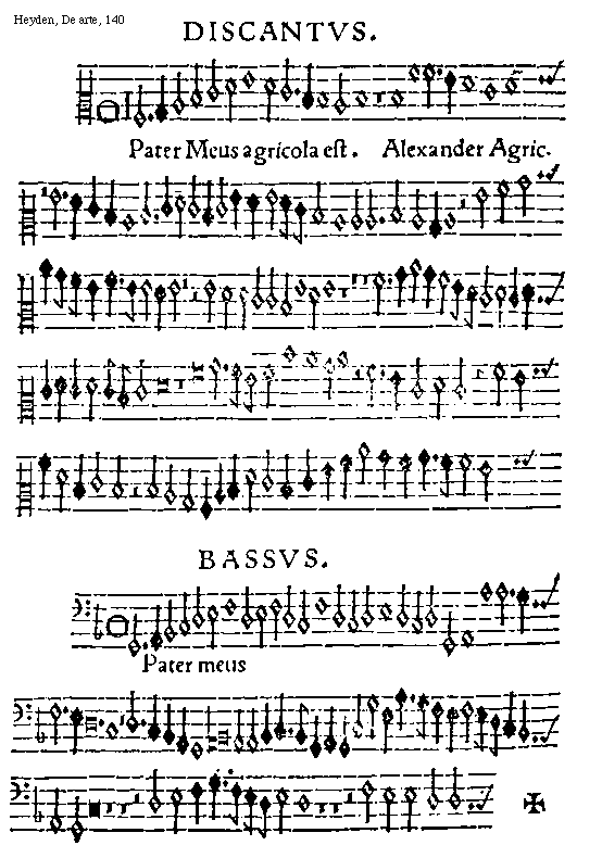 [Heyden, De arte, 140; text: DISCANTVS. Pater Meus agricola est. Alexander Agricola, BASSVS. Pater meus.]