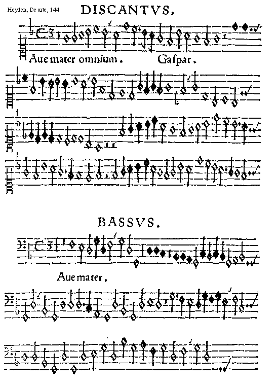 [Heyden, De arte, 144; text: DISCANTVS. Aue mater omnium. Gasparis, BASSVS.]