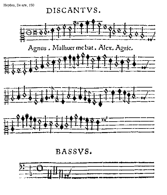 [Heyden, De arte, 150; text: DISCANTVS. Agnus. Malhuer me bat. Alexander Agricola, BASSVS]