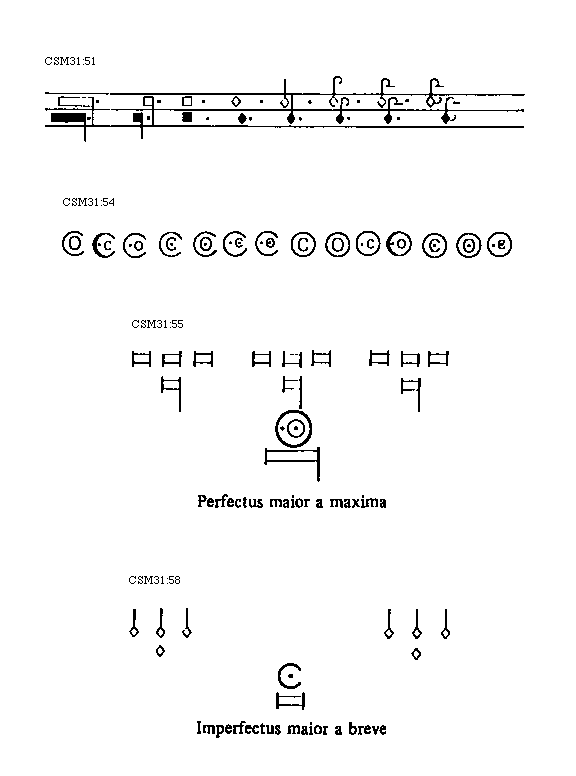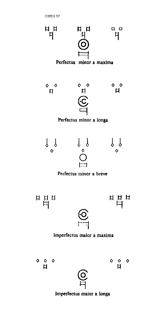 [57][CSM31:57; text: Perfectus minor a maxima, Perfectus minor a longa, Perfectus minor a breve, Imperfectus maior a maxima, Imperfectus maior a longa]