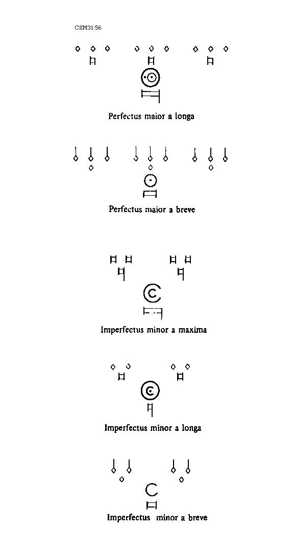 [56][CSM31:56; text: Perfectus maior a longa, Perfectus maior a breve, Imperfectus minor a maxima, Imperfectus minor a longa, Imperfectus minor a breve]