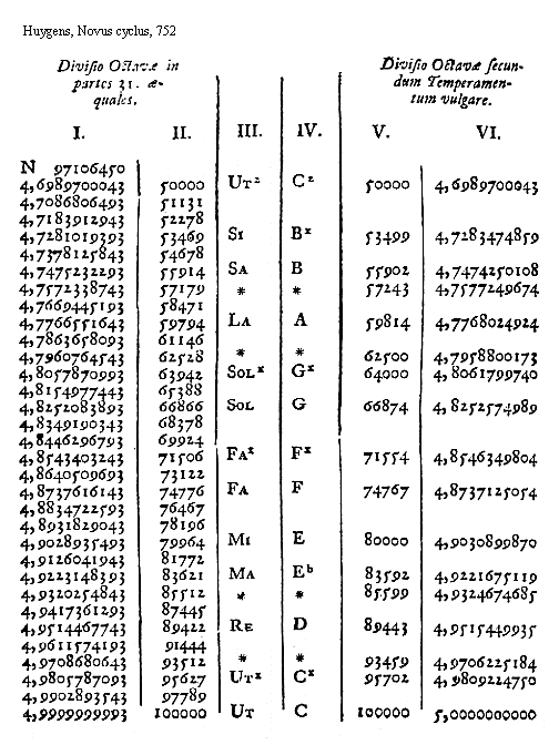 [752][Huygens, Novus cyclus, 752; text: Divisio Octavae in partes 31. aequales. secundum Temperamentum vulgare. I. II. III. IV. V. VI. Ut, Re, Ma, Mi, Fa, Sol, La, Sa, Si, A, B, C, D, E, F, G, N, 50000, 51131, 52278, 53469, 54678, 55914, 57179, 58471, 59794, 61146, 62528, 63942, 65388, 66866, 68378, 69924, 71506, 73122, 74776, 76467, 78196, 79964, 81772, 83621, 85512, 87445, 89422, 91444, 93512, 95627, 97789, 100000, 53499, 55902, 57243, 59814, 62500, 64000, 66874, 71554, 74767, 80000, 83592, 85599, 89443, 93459, 95702, 97106450, 4,6989700043, 4,7086806493, 4,7183912943, 4,7281019393, 4,7378125843, 4,7475232293, 4,7572338743, 4,7669445193, 4,7766551643, 4,7863658093, 4,7960764543, 4,8057870993, 4,8154977443, 4,8252083893, 4,8349190343, 4,8446296793, 4,8543403243, 4,8640509693, 4,8737616143, 4,8834722593, 4,8931829043, 4,9028935493, 4,9126041943, 4,9223148393, 4,9320254843, 4,9417361293, 4,9514467743, 4,9611574193, 4,9708680643, 4,9805787093, 4,9902893543, 4,9999999993, 4,7283474859, 4,7474250108, 4,7577249674, 4,7768024924, 4,7958800173, 4,8061799740, 4,8252574989, 4,8546349804, 4,8737125054, 4,9030899870, 4,9221675119, 4,9324674685, 4,9515449935, 4,9706225184, 4,9809224750, 5,0000000000]