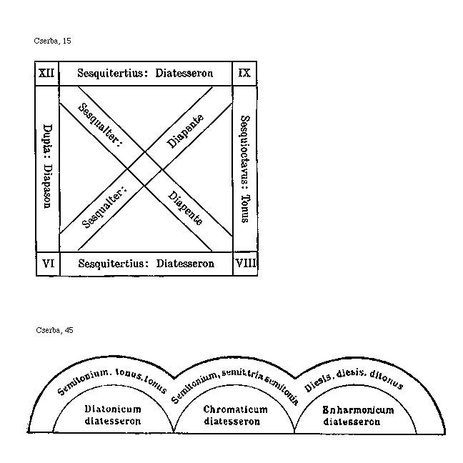 Cum igitur ante Pythagoram consonantiae musicae partim diapason, partim diapente, partim diatesseron, quae est consonantia minima, vocarentur, primus Pythagoras hoc modo repperit, qua proportione sibimet haec sonorum concordia jungeretur. Et ut clarius sit, quod dictum est, sint verbi gratia malleorum quatuor pondera, quae subter scriptis numeris continentur, XII, IX, VIII, VI. Hi igitur mallei, qui XII et VI ponderibus vergebant, diapason in duplo concinentiam personabant. Malleus vero XII ponderum ad malleum IX et malleus VIII ponderum ad malleum VI ponderum secundum epitritam proportionem diatesseron consonantiam