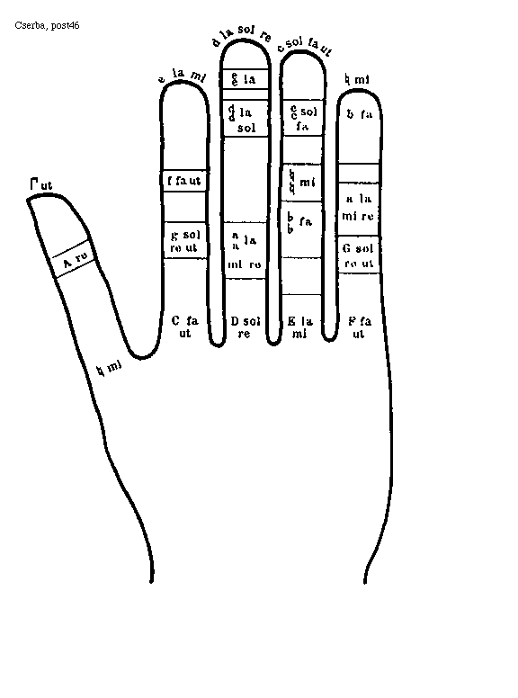 [171]et minore semitonio, a quo et diatonicum dicitur, usus retinuit. Quare modernorum quidam virtute dicti generis in octo tetrachorda totam manum diviserunt. Sub his autem quatuor terminis sumptis virtualiter ut prius, scilicet ut re mi fa, cujuslibet tetrachordi, excepto ultimo, scilicet octavo, qui fit per mi fa sol la, tria intervalla constituuntur. Horum autem primum tetrachordum est [116a] a [Gamma] ut in C fa ut, secundum a C fa ut in F fa ut, quae etiam gravia dicuntur, tertium ab F fa ut in b fa acutum, quartum a G sol re ut in c sol fa ut, quae dicuntur acuta, quintum a c sol fa ut in f fa ut superacutum, sextum ab f fa ut in bb fa duplicatum, quae superacuta dicuntur, septimum autem a g sol re ut minutum in cc sol fa duplicatum, octavum vero a [sqb][sqb] mi in ee la, quae dicuntur excellentia.