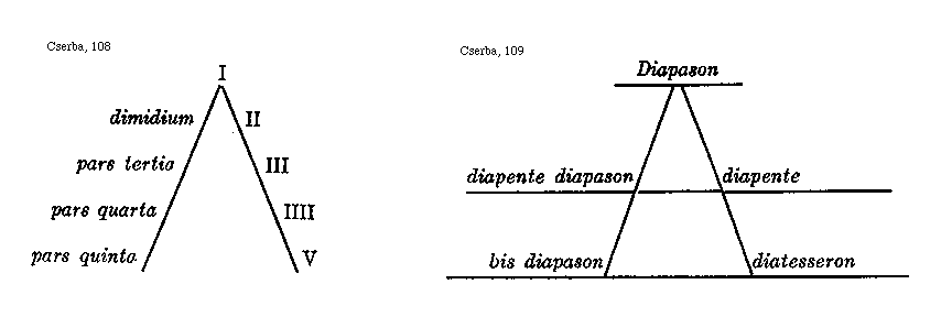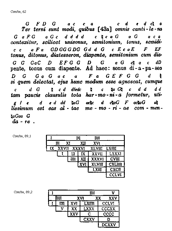 [177]post unamquamque pausam resumitur. Similiter et ex diapente raro intensive, rarius remissive, sed aliquando paecipue in tonis tonorum imparium post unamquamque pausam sumitur, sed indifferenter, ut in sequentiis versus post versum sumitur. -- Hic tamen gradus a sequenti deficit. Non enim in sua finali incipit, vel si in finali incipit, clamose ut in diapente vel in diatesseron salit, et iterum, si in uno et eodem cantu dictos modos frequenter ingeminat, sicut, verbi gratia, quantum ad inceptionem in evangelio "Liber generationis", quantum vero ad alia in Alleluja "Virga Jesse floruit". Item si in principio sui cantus mediocriter ascendit et descendit, reliquum vero totum clamose determinet, sicut in Alleluja "In die resurrectionis meae", et, quod deterius est, et magis defectuosus est si terminos tonorum suorum non implet. [120a]