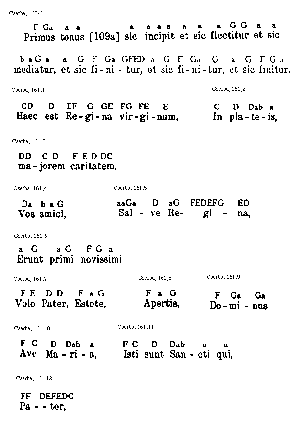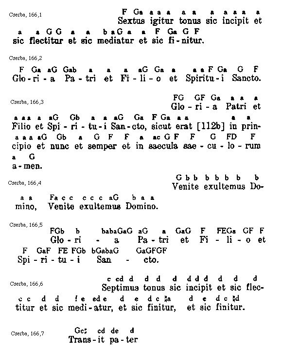 [Cserba, 166,1; text: Sextus igitur tonus sic incipit et sic flectitur et sic mediatur et sic finitur, F, G, a, b]
