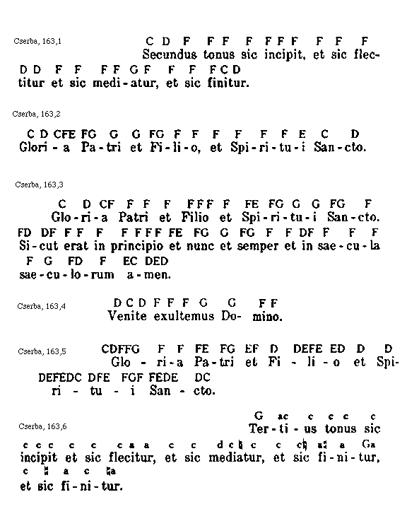 [Cserba, 163,1; text: Secundus tonus sic incipit, et sic flectitur et sic mediatur, et sic finitur, C, D, F, G]