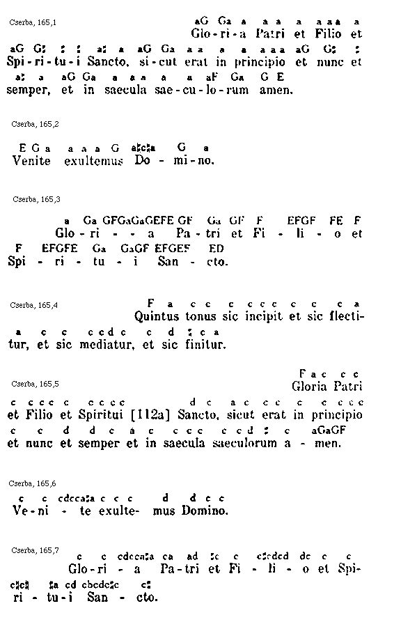 [Cserba, 165,5; text: Gloria Patri et Filio et Spiritui [112a] Sancto, sicut erat in principio et nunc et semper et in saecula saeculorum amen, F, a, c, d, [sqb], G, F]