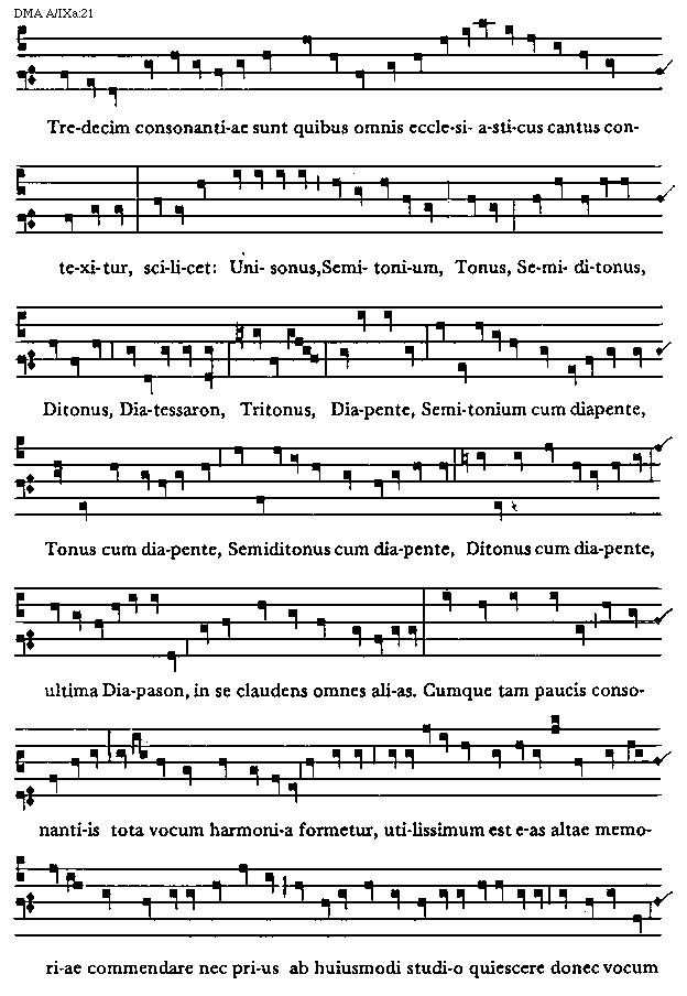 [13r in marg.] [DMA A/IXa:21; text: Tredecim consonantiae sunt quibus omnis ecclesiasticus cantus contexitur, scilicet: Unisonus, Semitonium, Tonus, Semiditonus, Ditonus, Diatessaron, Tritonus, Diapente, Semitonium cum diapente, Tonus cum diapente, Semiditonus cum diapente, Ditonus cum diapente, ultima Diapason, in se claudens omnes alias. Cumque tam paucis consonantiis tota vocum harmonia formetur, utilissimum est eas altae memoriae commendare nec prius ab huiusmodi studio quiescere donec vocum]