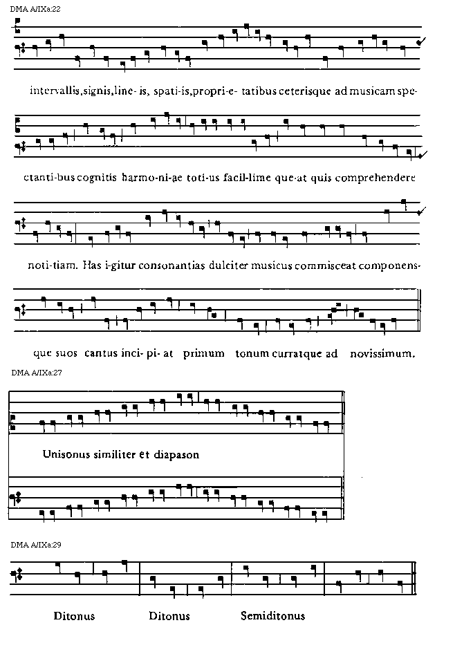[22][DMA A/IXa:22; text: intervallis, signis, lineis, spatiis, proprietatibus ceterisque ad musicam spectantibus cognitis harmoniae totius facillime queat quis comprehendere notitiam. Has igitur consonantias dulciter musicus commisceat componensque suos cantus incipiat primum tonum curratque ad novissimum.]