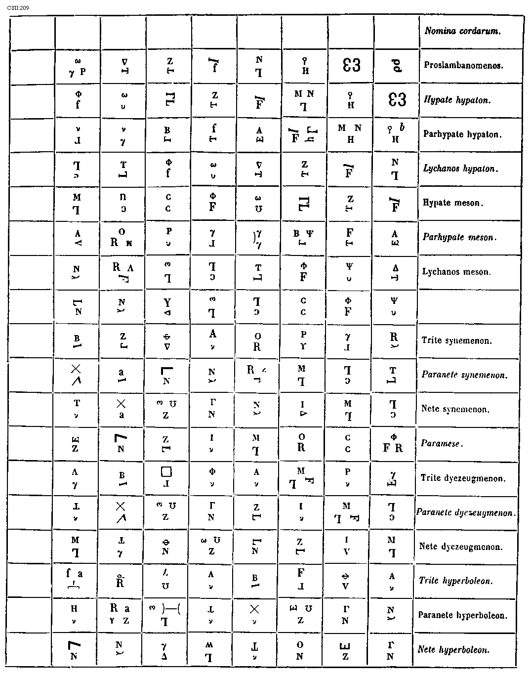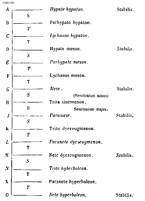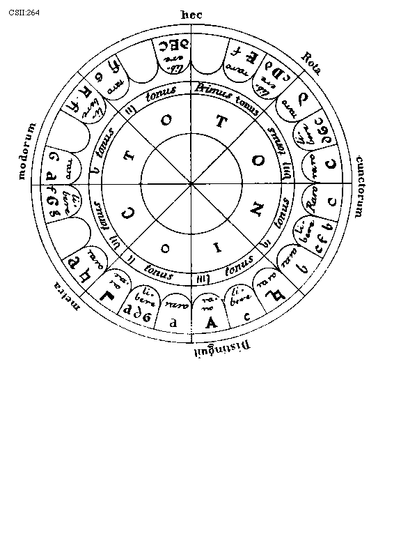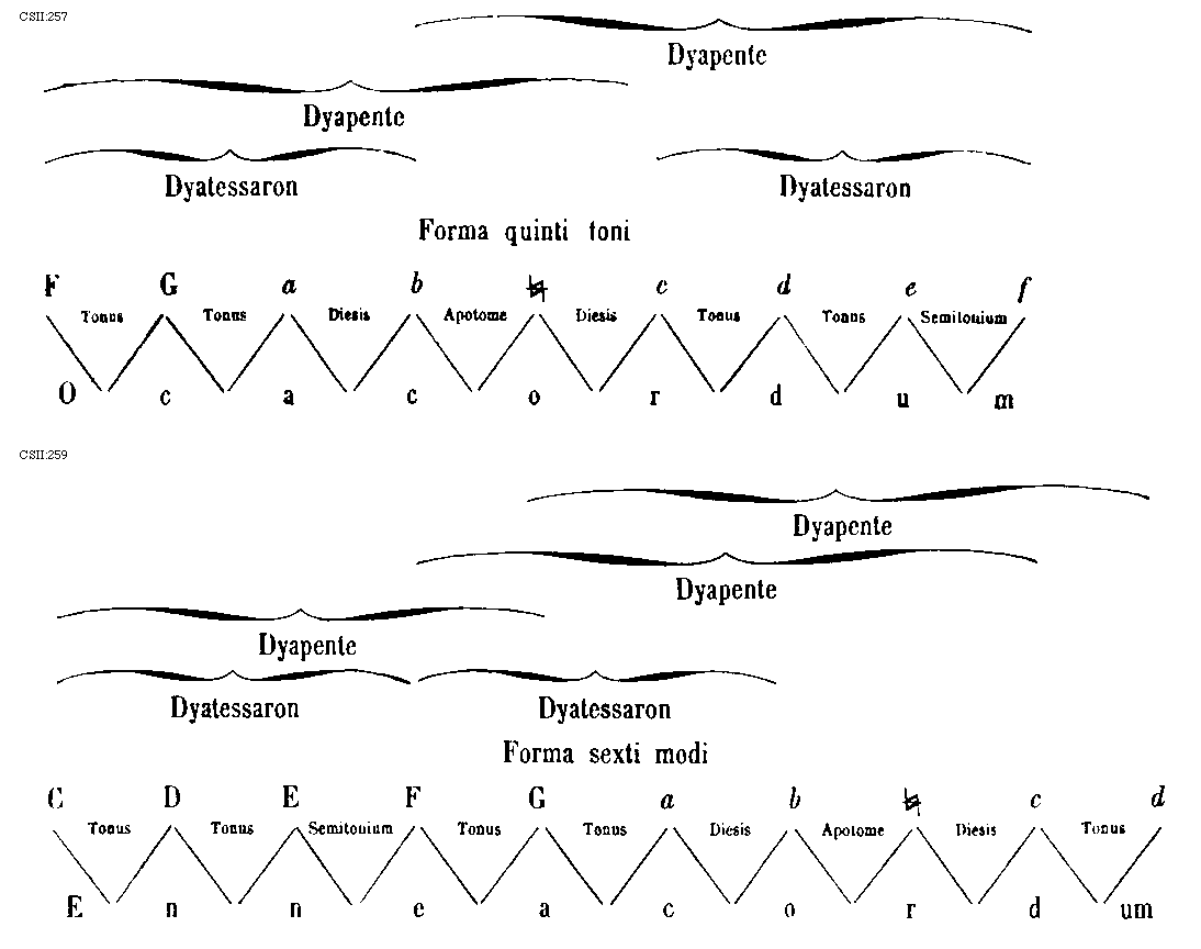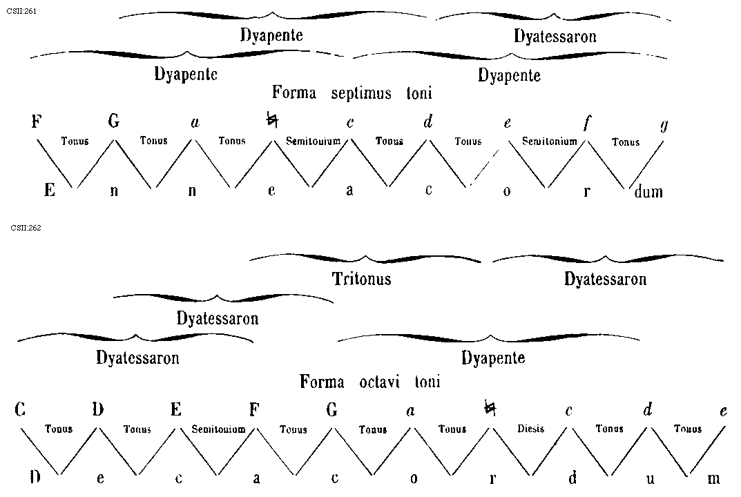 [274][CSII:274; text: Formula sexti toni. Hypolydius id est sextus tonus, Sextus tonus quia plagalis est tertius constat tertia gravium, Tres cordas proprie plagalem constat habere, Hypolydii media finalisque corda, Fit tribus in cordis autenti vis specialis, Lydii prima finalisque corda, Mediatur tertia finalium ascendit legitime ad tertiam superiorum, Formula quinti toni. Lydius id est quintus tonus, Tonus quintus quia est tertius autentus constat tertia finalium, Mediatur tertia superiorum terminatur naturaliter excellentium, Lydii corda mediatrix, Hypodorii corda terminalis, Constitutio autenti triti et subjugalis sui a c gravi ad f excellentem undecim extensa cordis, Autenti plage commune sub est dyapente, Species tertia dyatessaron, Species tertia dyapente, Tertia species dyatessaron, Formula octavi toni. Hypermixolydius id est octavus tonus, Octavus tonus quia quartus est plagalis vertiatur quartus gravium mediatur, Tres infra corde comitis sunt sub dictione, Mediatrix corda atque finalis hypomixolydii, Mixolydii prima finalis corda, Quarta finalium terminatur quarta superiorum, Formula septimi toni. Mixolydius id est septimus tonus, Tonus septimus quia autentus est quartus incipit quarta finalium, Mixolydii corda mediatrix, Hypomixolydii corda terminalis, Mediatur quarta superiorum ascendit legitime ad quartam excellentem, Tres subjure ducis corde resonant in acutis, Dispositio autenti tetrardi et litteras sui a D gravi ad g excellentem undecim cordas habens, Quinque fides medie subjungere sonant in acutis, Quarta species dyatessaron, Quarta species diapente, Quarta species dyatessaron, C, D, E, F, G, a, b, [sqb], c, d, e, f]