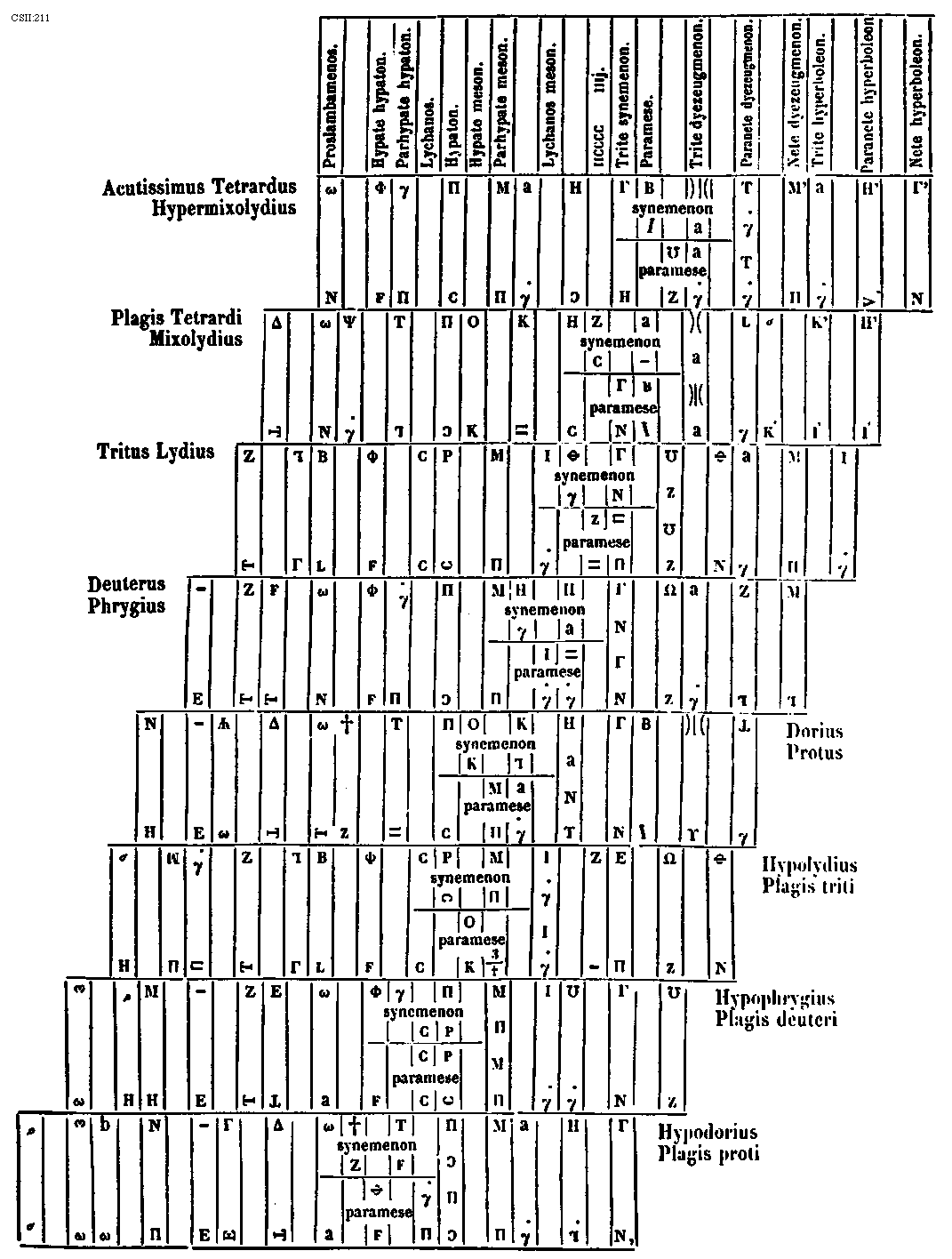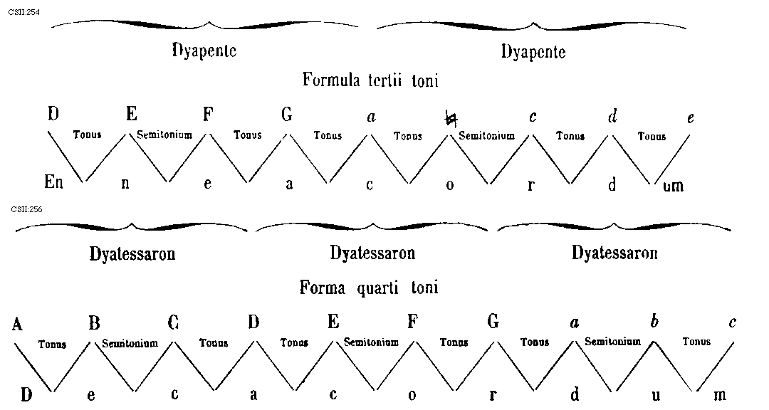 [CSII:275; text: Plaga prothi constat ex eadem specie dyapente qua autentus ejus ex eadem specie dyatessaron inferius; incipitque seculorum amen hujus superius in voce tertia a finali ejus. MATRONALIS CHORUS, CHORUS VIRILIS, Proprietas plagalis tres inferius corde, Proprietas autenti tres corde superius, quinque corde communes utriusque, principalis, Dispositio prothi et subjugalis sui, primi plagalis id est secundi toni dispositio, thalamus finalis, primi autenti id est primi toni dispositio, Authentus prothus constat ex prima specie dyapente superius et ex prima specie dyatessaron superius; incipiuntque seculorum amen hujus superius in voce quinta a sui finali. Plagalis deuteri constat ex eadem specie dyapente qua autentus ejus ex eadem specie dyatessaron inferius; incipiunt autem istius toni seculorum amen in voce quarta a finali sui. CHORUS MATRONALIS, CHORUS VIRILIS, Proprietas plagalis tres inferius corde, Proprietas autenti tres superius corde, quinque corde communes utriusque, principalis, Dispositio deuteri et subjugalis sui, secundi plagalis id est quarti toni, secundi autenti id est tertii toni dispositio, thalamus finalis, Autentus deuterus constat ex secunda specie dyapente superius et eadem specie dyatessaron superius; incipiunt autem seculorum amen ipsius altius a finali dyapente et semitonii intervallo. A, B, C, D, E, F, G, a, b, [sqb], c, d, e]