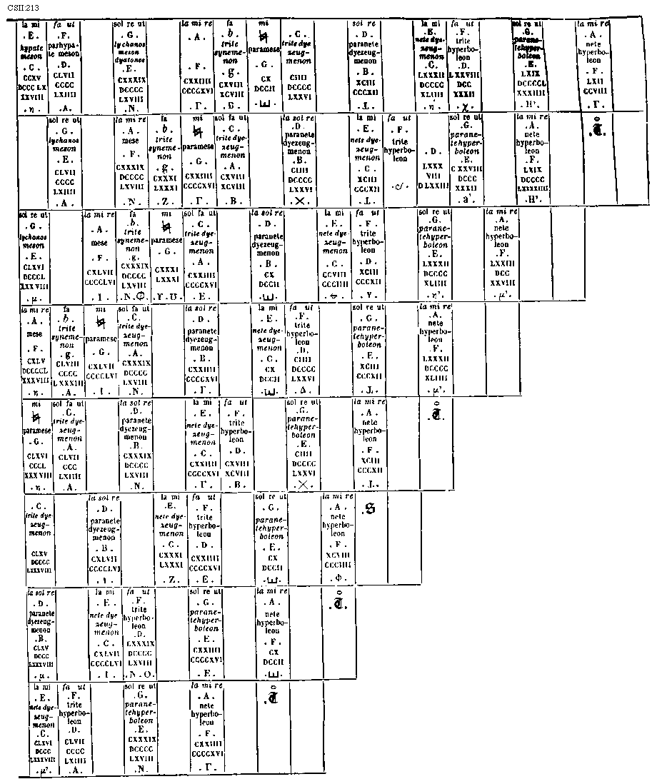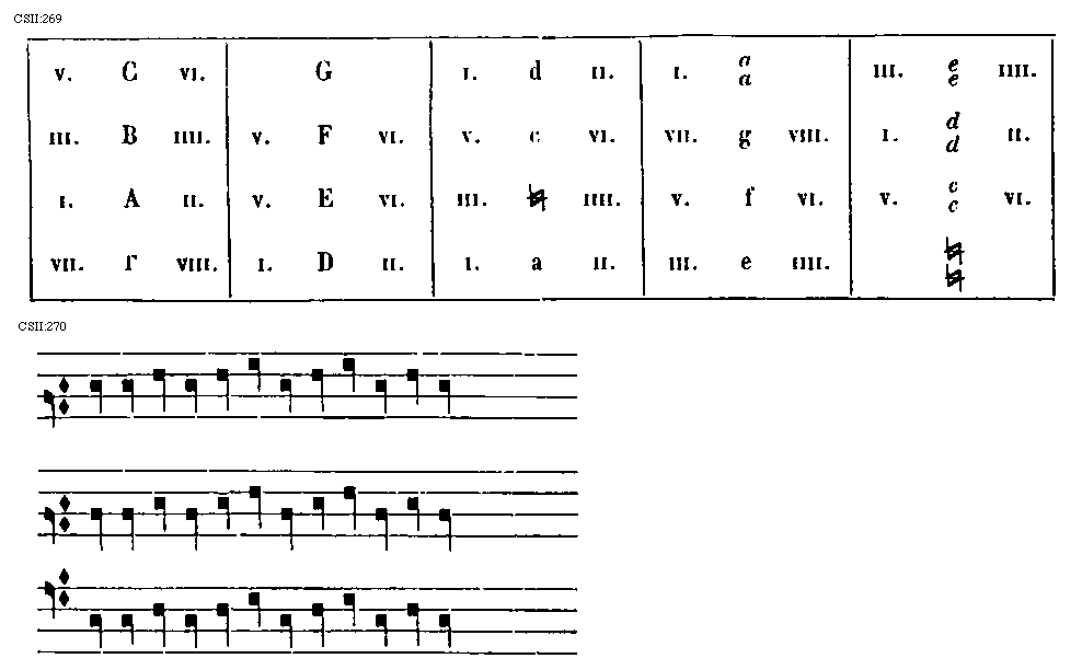 [CSII:269; text: I. II. III. IIII. V. VI. VII. VIII. [Gamma], A, B, C, D, E, F, G, a, [sqb], c, d, e, f, g, aa, [sqb][sqb], cc, dd, ee]