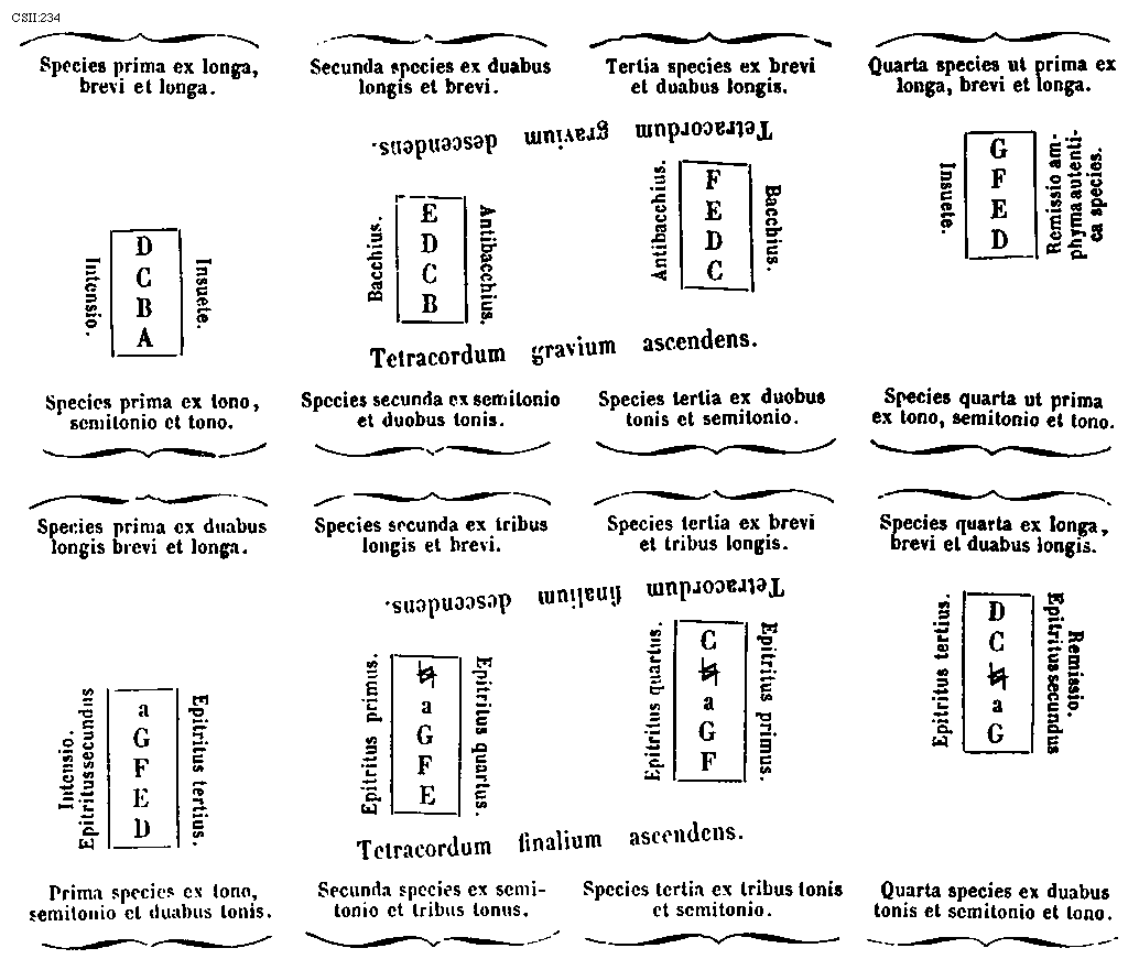 Posita est tonorum quadripartita figura que antiquitus tempore suo inventionis in tantum fuit venerabilis ut paucissima sine ea essent monocorda. Hec autem ita constituitur ut una series primi simul et secundi toni mensuram contineat, secunda tertii et quarti, tertia quinti et sexti, quarta septimi et octavi. Cujus dispositio magne commoditati famulatur, nam sicut post abecedarii in discretam generalemque seriem specialiter erant coadunande vocales, semivocales et mute, sic post naturalem monocordi mixtionem specialius erant tropi cum suis subjugalibus discernendi sicut etiam elementa lucidius apparuerunt discreta relicto sinu prime confusionis. Ita dispositis separatim tropis evidentius intuemur qualiter prothus cum suo subjugali constat prima
