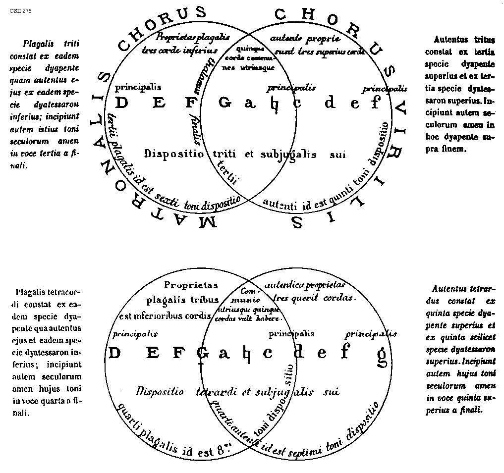 [276][CSII:276; text: Plagalis triti constat ex eadem specie dyapente quam autentus ejus ex eadem specie dyatessaron inferius; incipiunt autem istius toni seculorum amen in voce tertia a finali. MATRONALIS CHORUS, CHORUS VIRILIS, Proprietas plagalis tres corde inferius, autente proprie sunt tres superius corde, quinque corde communes utriusque, principalis, thalamus finalis, tertii plagalis id est sexti toni dispositio, tertii autenti id est quinti toni dispositio, Dispositio triti et subjugalis sui, Autentus tritus constat ex tertia specie dyapente superius et ex tertia specie dyatessaron superius. Incipiunt autem seculorum amen in hoc dyapente supra finem. Plagalis tetracordi constat ex eadem specie dyapente qua autentus ejus et eadem specie dyatessaron inferius; incipiunt autem seculorum amen hujus toni in voce quarta a finali. Proprietas plagalis tribus est inferioribus cordis, autentica proprietas tres querit cordas. Communio utriusque quinque cordas vult habere. principalis, Dispositio tetrardi et subjugalis sui, quarti plagalis id est 8vi. toni dispositio, quarti autenti id est septimi toni dispositio, Autentus tetrardus constat ex quinta specie dyapente superius et ex quinta scilicet specie dyatessaron superius. Incipiunt autem hujus toni seculorum amen in voce quinta superius a finali. D, E, F, G, a, [sqb], c, d, e, f, g]