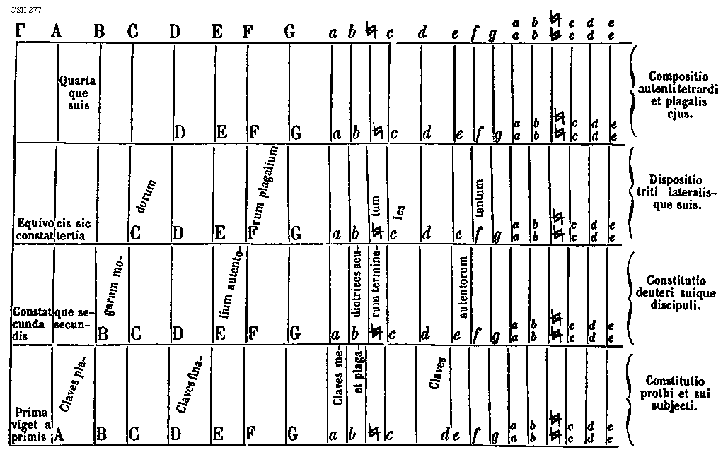 [CSII:277; text: [Gamma], A, B, C, D, E, F, G, a, b, [sqb], c, d, e, f, g, aa, bb, [sqb][sqb], cc, dd, ee, Quarta que suis, Compositio autenti tetrardi et plagalis ejus. Equivocis sic constat tertia, Dispositio triti lateralisque suis. Constat que secunda secundis, Constitutio deuteri suique discipuli. Prima viget a primis, Constitutio prothi et sui subjecti. Claves plagarum modorum, Claves finalium autentorum plagalium, Claves mediotrices acutum et plagarum terminales, Claves autentorum tantum]