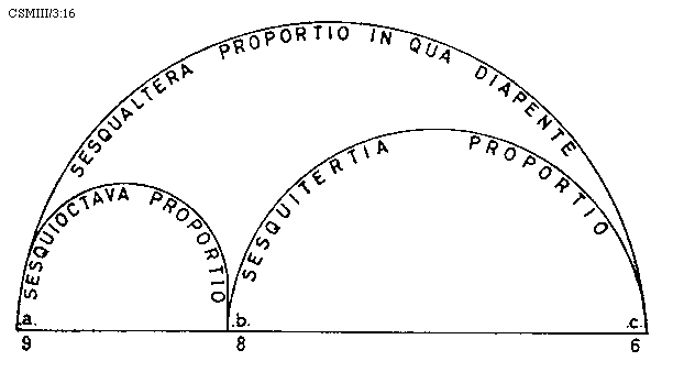His suppositis, arguitur sic: "Sicut se habet .a.c. ad .b.c., sic apotome ad diesim", quia .a.c. signat apotomen et .b.c. diesim. Sed .a.c. superat .b.c. in numero qui est .d. Ergo apotome diesim superat in commate, quod est inter .a.b. cuius differentiam significat .d. Confirmari possunt hae ex dictis in praecedenti capitulo, ubi enim sunt tres inaequales quicumque termini. Proportio terminorum extremorum continet in se duas intermedias proportiones; sic differentia