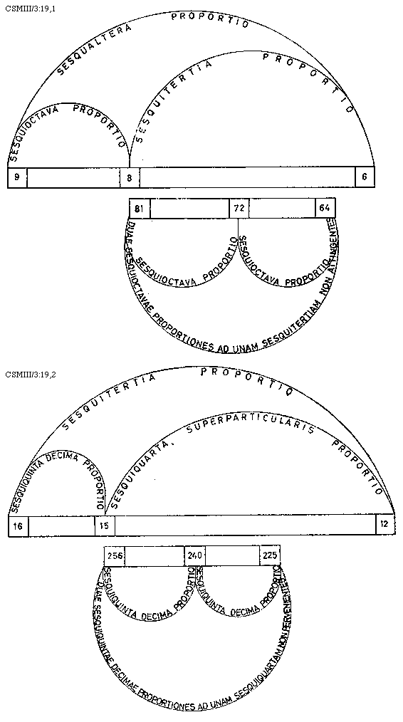 [8]Ostensum est etiam, libro praecedenti, consonantiarum praecedentium diapente proportiones superpartientes minores esse sesqualtera proportione, sequentium vero maiores, nec aliquae simplices ad duplam attingunt, sicut nec illarum consonantiae ad diapason, sed illarum mixtae proportiones duplam vincunt; tripla tamen et quadrupla et ceterae sequentes multiplices simplices multas superant superpartientes mixtas proportiones.