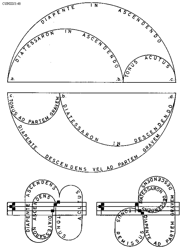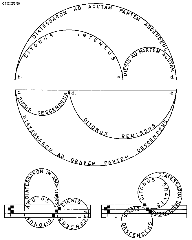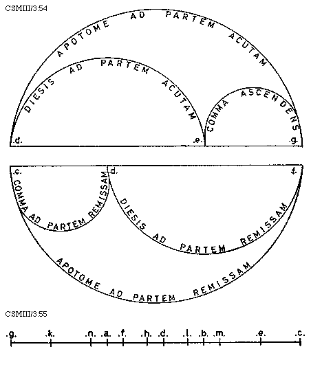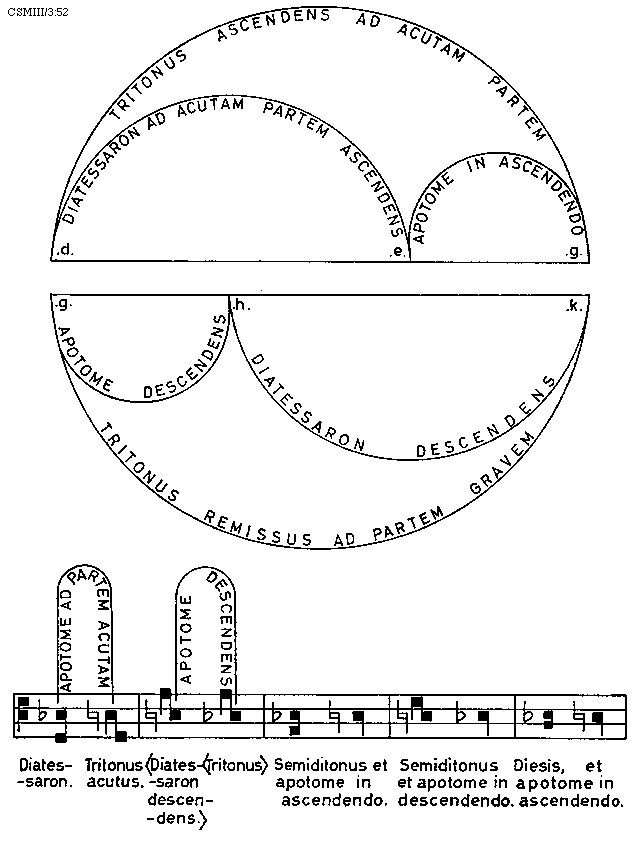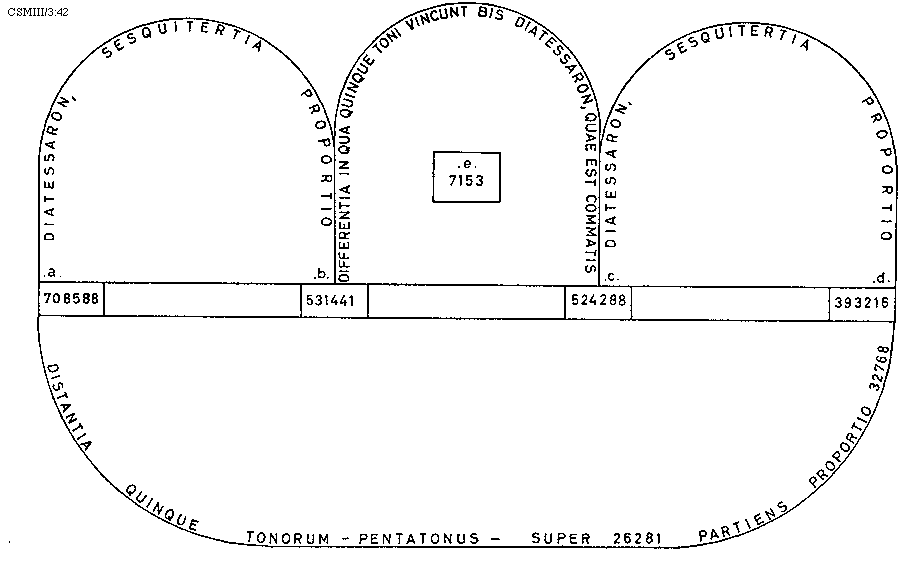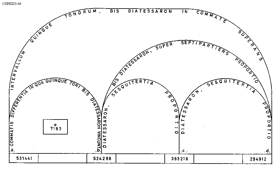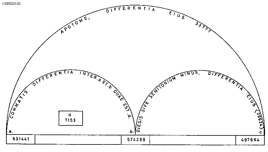 [82][CSMIII/3:82; text: Apotome, differentia eius 33777, Commatis differentia inter .a. et .b. quae est .d. Diesis sive semitonium minus, differentia eius 26624, d, 7153, .a. .b. .c. 531441, 524288, 497664]