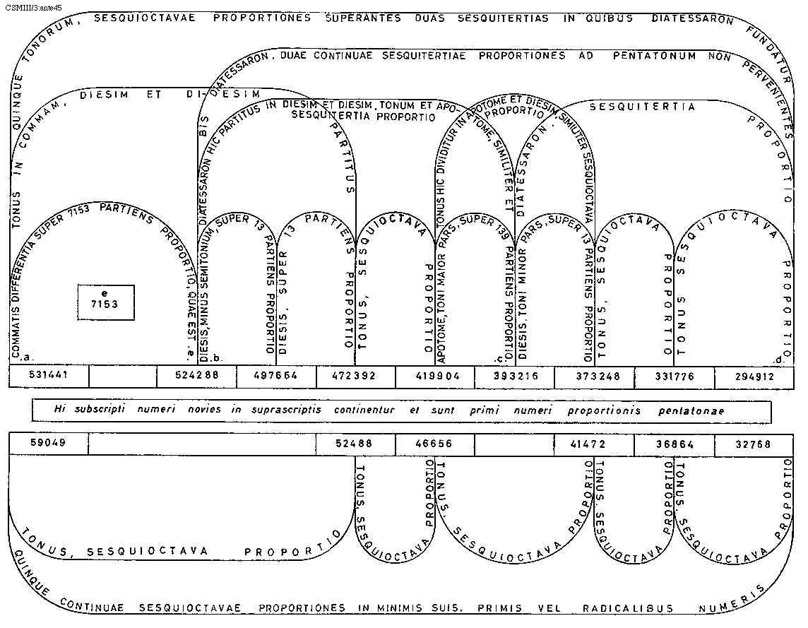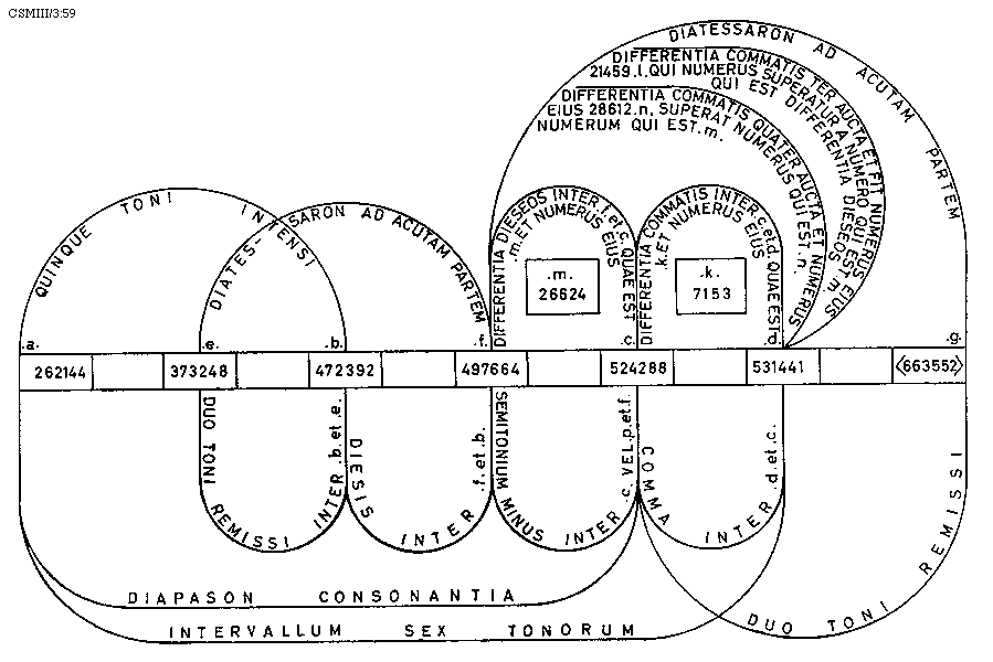 [63][CSMIII/3:63; text: Diapason dupla proportio, Intervallum quinque tonorum, Differentia toni quae est inter .b. et .d. et fit .f. numerus eius, Commatis differentia inter .c. et .d. et fit .e. numerus eius, Comma novies multiplicatum facit hunc numerum 64377 qui est .h. superans numerum qui est .f. Comma octies auctum inducit numerum hunc 57224 qui est .g. hic superatur a numero qui est .f. .f. 59049, .e. 7153, .a. .b. .c. .d. 262144, 472392, 524288, 531441, Tonus sesquioctava proportio, Intervallum sex tonorum]