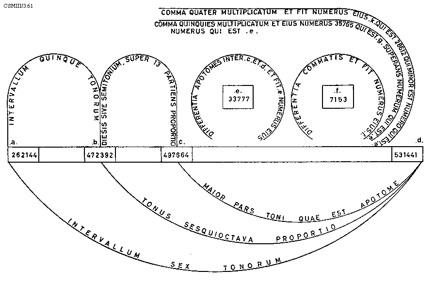 [61][CSMIII/3:61; text: Intervallum quinque tonorum, Diesis sive semitonium, super 13 partiens proportio, Differentia apotomes inter .c. et .d. et fit .e. numerus eius, Differentia commatis et fit numerus eius .f. Comma quinquies multiplicatum et eius numerus 35765 qui est .g. superans numerum qui est .e. Comma quater multiplicatum et fit numerus eius .k. qui est 28612 qui minor est numero qui est .e. .e. 33777, .f. 7153, .a. .b. .c. .d. 262144, 472392, 497664, 531441, Maior pars toni quae est apotome, Tonus sesquioctava proportio, Intervallum sex tonorum]