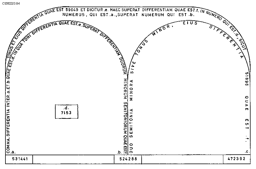 [84][CSMIII/3:84; text: Tonus et eius differentia quae est 59049 et dicitur .e. Haec superat differentiam quae est .f. in numero qui est .d., sicut numerus, qui est .a., superat numerum qui est .b. Comma. Differentia inter .a. et .b. quae est .d. in qua toni differentia quae est .e. superat differentiam duorum minorum semitoniorum quae est .f. Duo semitonia minora sive tonus minor, eius differentia 51896 quae est .f. .d. 7153, .a. .b. .c. 531441, 524288, 472392]
