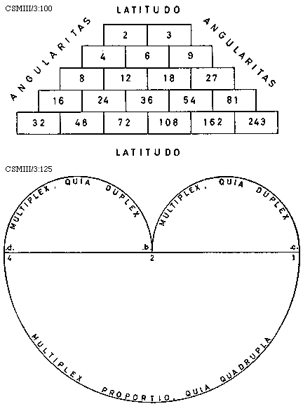 [101]Potest autem ex tacta descriptione percipi quod minimi termini mensurant alios maiores tam angulariter quam directe sub illis positos ex parte utraque ipsius angularitatis, ut binarius numerat omnes numeros ibi contentos, praeter ternarium et eos qui a solo producuntur ternario, ut sunt 9 27 81 243. Et consimiliter ternarius mensurat omnes numeros ibi contentos, praeter binarium et eos qui per binarii multiplicationem generantur, et sunt 4 8 16 32.