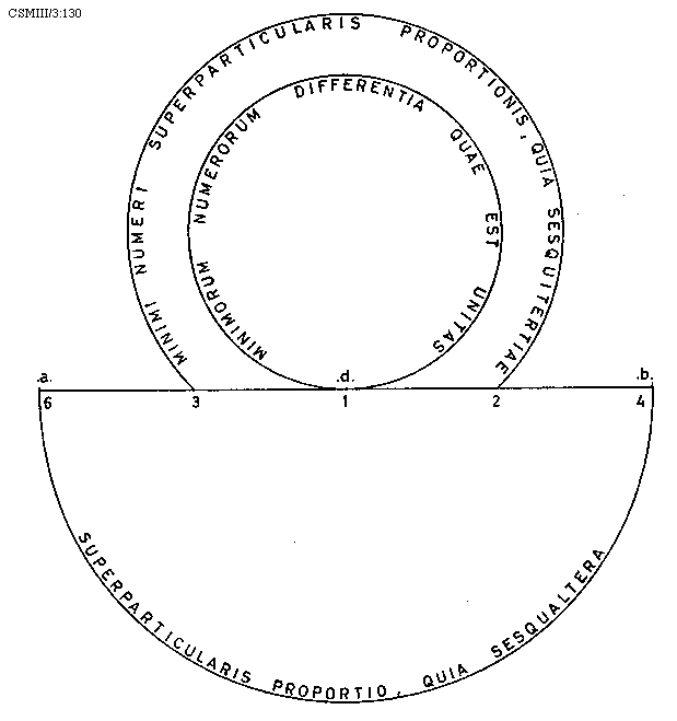 [152]integra sesquioctavae proportionis medietate, et quod ipsa etiam proportio .c.b. est minor proportione quae est .a.c. Item oportet quod .d.b. proportio sit minor proportione .a.c., quia probabitur .a.c. proportionem maiorem esse integra toni medietate vel proportionis sesquioctavae. Est autem .a.c. proportio sesquisexta decima, .c.b. vero sesquiseptima decima. Si ergo dare est integram toni vel sesquioctavae proportionis medietatem, illa cadet inter sesquisextam decimam et sesquiseptimam decimam, minor existens sesquisexta decima, maior vero sesquiseptima decima. Sed hoc in integro numero nullo modo potest inveniri, quia tunc inter 18 et 16 caderet unus numerus distinctus a 17, qui scilicet esset minor quam 18 et non esset 17, et esset maior quam 16, et non esset 17. Hoc autem non est possibile. Et, si sic, non est igitur dare aliquam proportionem mediam inter sesquiseptimam decimam et sesquisextam decimam, quia illi nullus integer respondet numerus qui scilicet eandem proportionem habeat ad 16 cum ea quae est ipsorum 18 ad numerum illum.