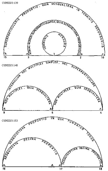 [CSMIII/3:153; text: Sesquioctava proportio in qua fundatur tonus, Sesquisexta decima proportio, Sesquiseptima decima proportio, a. .d. .c. .b. 16, 17, 18]