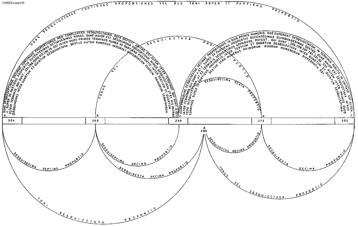 [ante 155][CSMIII/3:ante155; text: Duae sesquioctavae continuae proportiones vel duo toni super 17 partiens proportio, Duae sesquiseptimae decimae continuae proportiones non complentes sesquioctavam, quia deficit unitas. Est autem, inter terminos qui sunt .a. et .c., super 35 partiens proportio ducentesimas octuagesimas nonas, quae maior est sesquinona proportione, minor sesquioctava ut ex his patere potest terminis, qui sunt: .324.289.350.315.280.35. Est inter duos primos terminos super 35 partiens proportio, inter tertium et quartum sesquinona, inter quartum et quintum sesquioctava. Sextus autem numerus importat differentiam duorum primorum terminorum. Tonus vel sesquioctava proportio; Sesquidecima sexta proportio, Duae continuae sesquisextae decimae proportiones in suis primis numeris. Hae superant sesquioctavam, in terminis positis, in unitate. Est autem, inter terminos qui sunt .c. et .f., super 33 partiens proportio ducentesimas quinquagesimas sextas, quae maior est sesquioctava, minor vero sesquiseptima, ut ex terminis sequentibus apparere potest, qui sunt: .289.256.297.264.231.33. Est autem inter primos duos terminos super 33 partiens proportio, inter tertium et quartum sesquioctava, inter quartum et quintum sesquiseptima. Sextus vero numerus primorum duorum numerorum differentia est..b. .e. 306, 272, .d. 288, Sesquidecima septima proportio, Sesquiseptima decima proportio, Sesquisexta decima proportio, Sesquidecima decima proportio, Toni sesquioctava proportio, Tonus vel sesquioctava proportio]