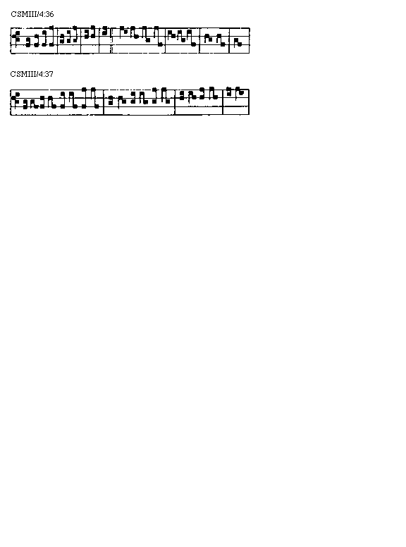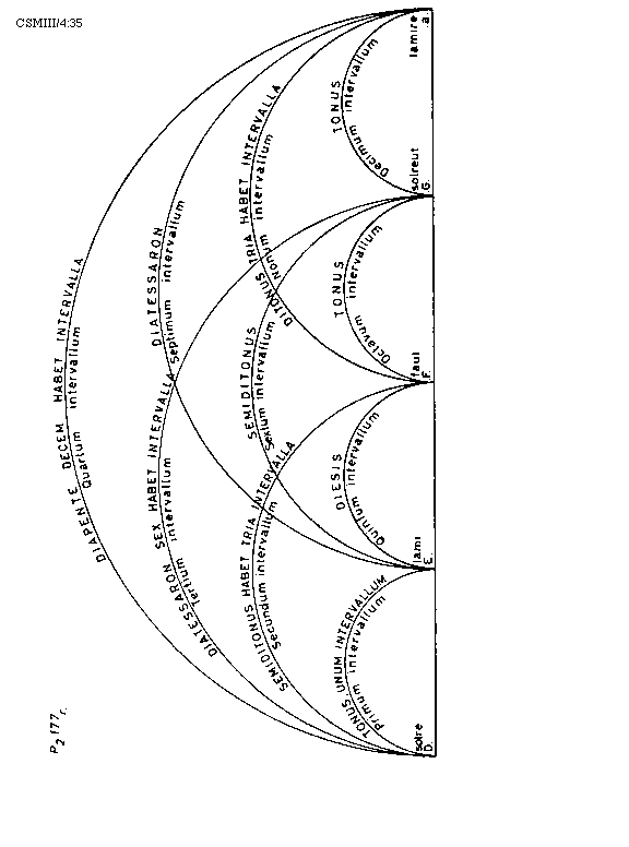 [125]Octava, quae est diapason, partitur in diapente et diatessaron, et convenientius est ut diapente inferius et diatessaron ponantur superius. Item, descendendo in semiditonum, tonum, semiditonum et ditonum.