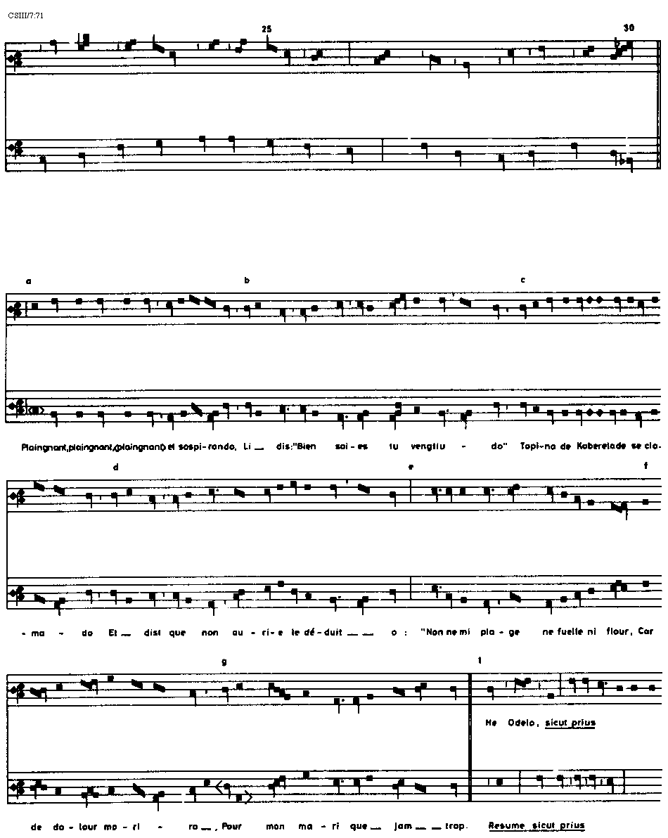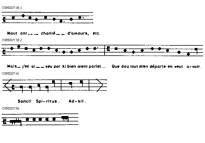 Sed cantus alios multos dimiserunt quibus in propria forma non utuntur, sicut fecerunt Antiqui, ut cantus organicos mensuratos vel non ubique mensuratos ut est organum purum vel duplum de quo forsan pauci sciunt Modernorum; item conductos, cantus ita pulchros, in quibus tanta delectatio est, qui sunt ita artificiales et delectabiles, duplices, triplices et quadruplices: item hoketos similiter duplices, contraduplices, triplices et quadruplices.