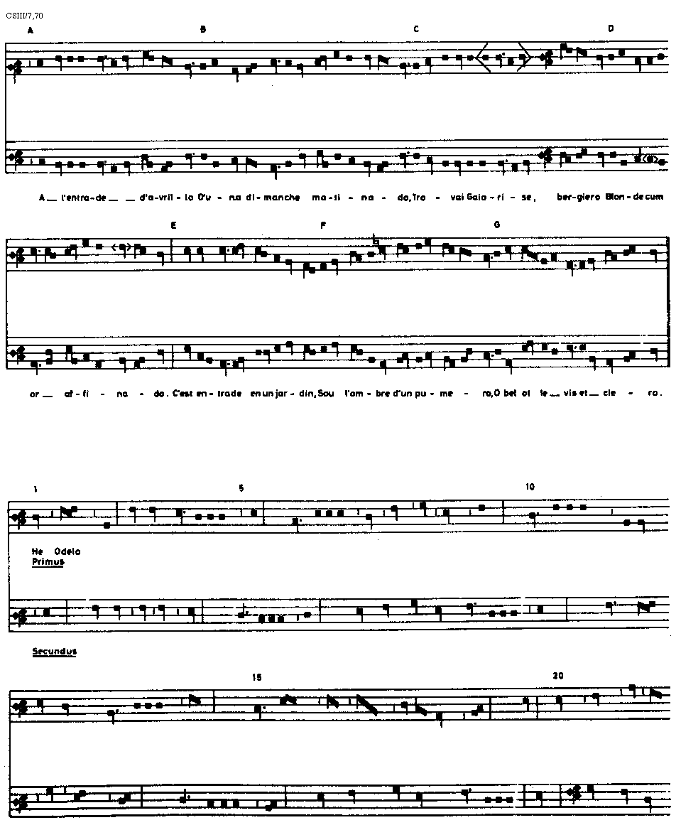 Magister autem Franco discantum sic describit: Discantus est diversorum cantuum consonantia in qua illi diversi cantus per voces longas, breves vel semibreves proportionaliter adaequantur et, in scripto, per debitas figuras proportionari ad invicem designantur.