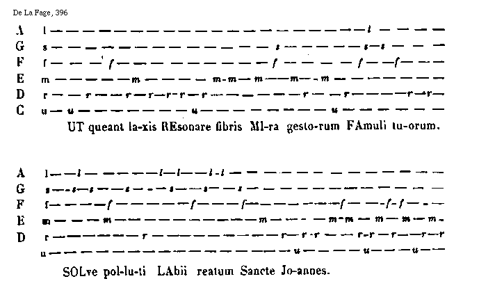[De La Fage, 396; text: A, G, F, E, D, C, u, r, m, f, s, l, UT queant laxis REsonare fibris MIra gestorum FAmuli tuorum. SOLve polluti LAbii reatum Sancte Johannes.]