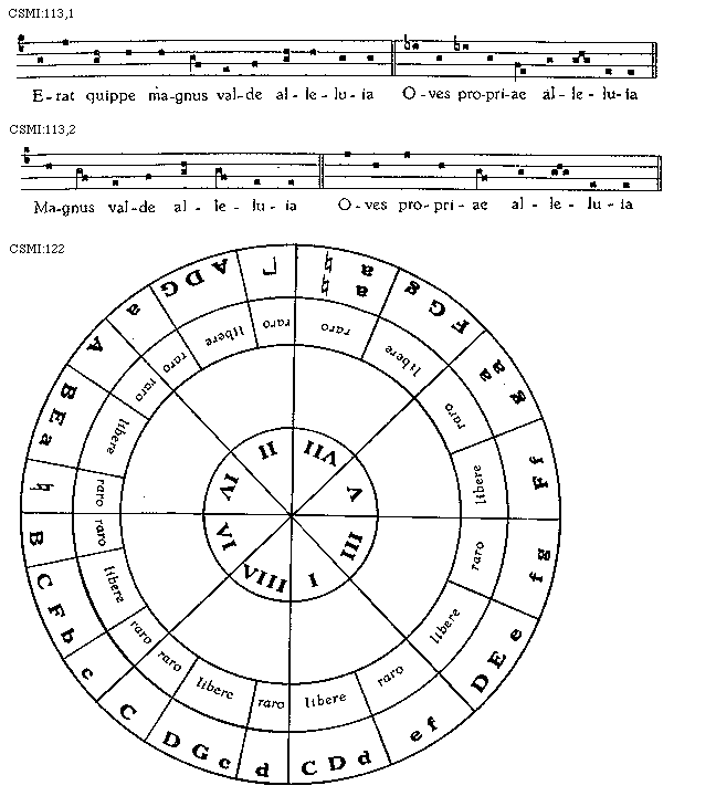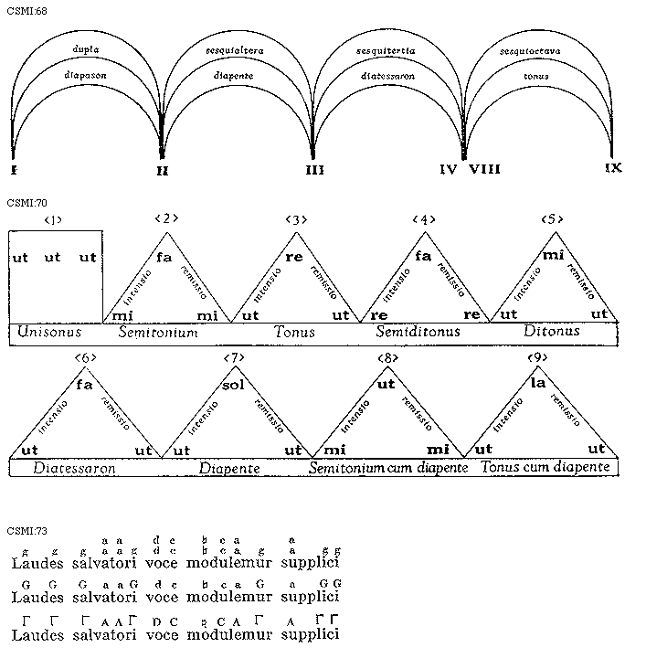 Inter cetera hoc quoque scire convenit, quod novem omnino sunt modi, quibus melodia contexitur: unisonus, semitonium, tonus, ditonus, semiditonus, diatessaron, diapente, semitonium cum diapente, tonus cum diapente. Ex his sex consonantiae dicuntur, vel quia in cantu saepius consonant id est simul sonant, vel certe quod consonant id est quibusdam proportionibus natae invicem se continent, quae dicuntur sesquioctava, sesquitertia, sesquialtera, dupla.