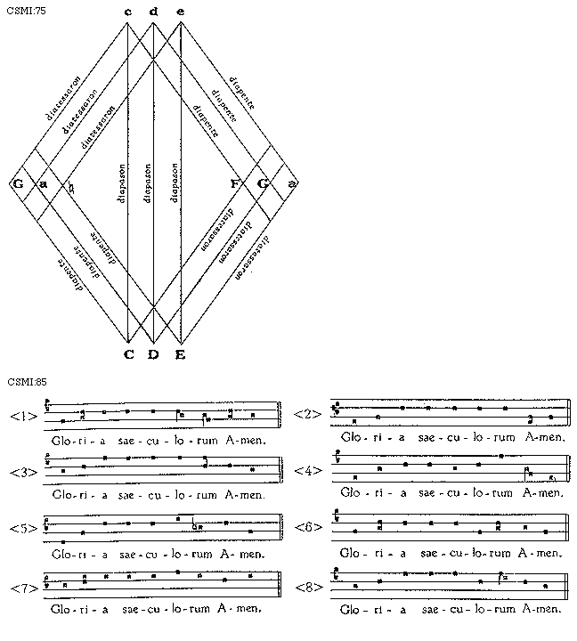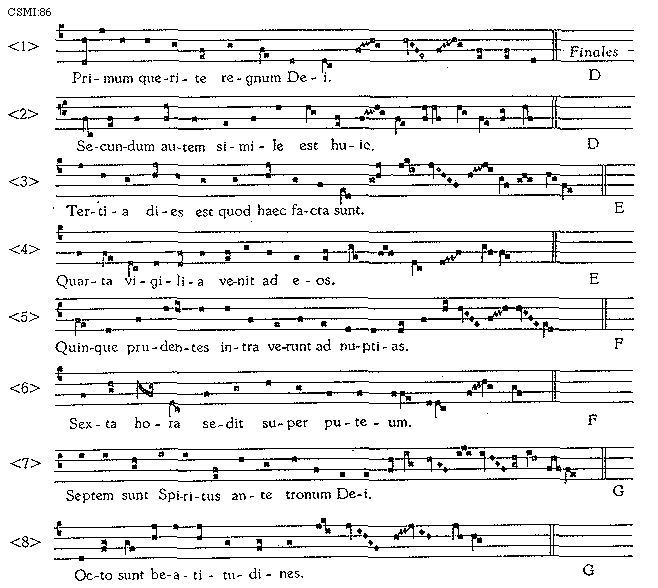 [183]Unam iste tonus habet differentiam, quae recipit antiphonas in parhypatemeson inchoantes ut istae: