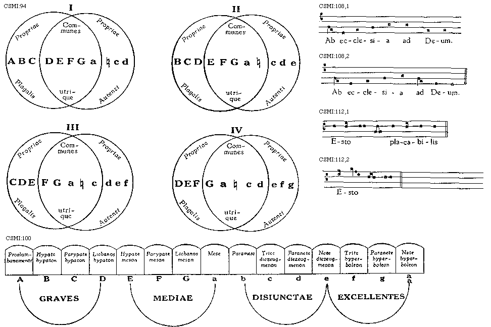 [197]Differentias tres habet tonus iste. Prima recipit antiphonas in parhypatemeson vel sub ea in proxima incipientes, ut istae: