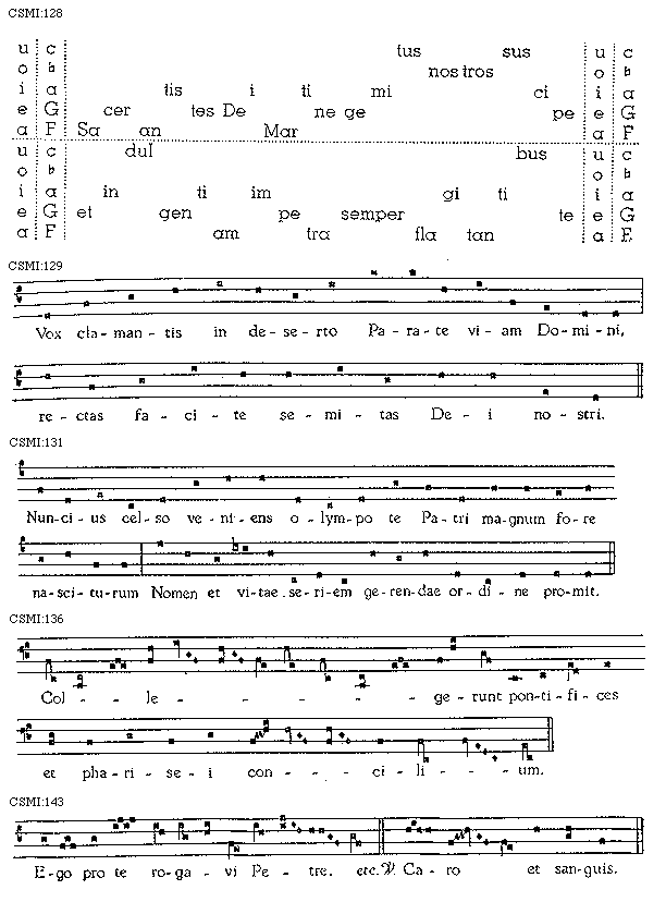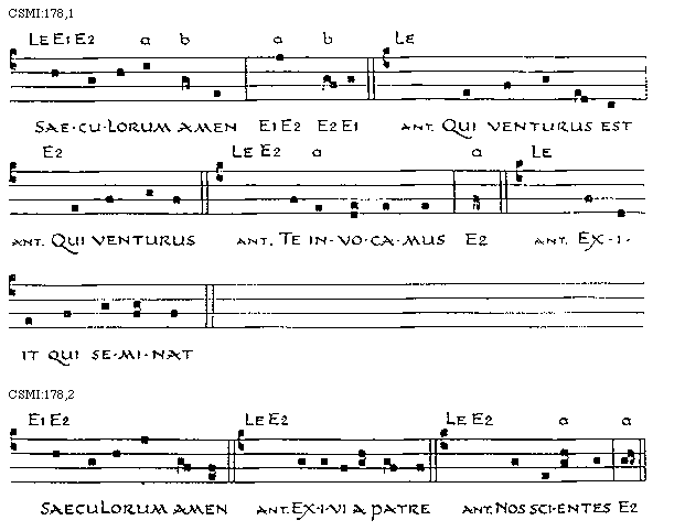[CSMI:178,1; text: Le, E1, E2, a, b, Saeculorum amen, antiphona Qui venturus est, antiphona Qui venturus, antiphona Te invocamus, antiphona Exiit qui seminat]
