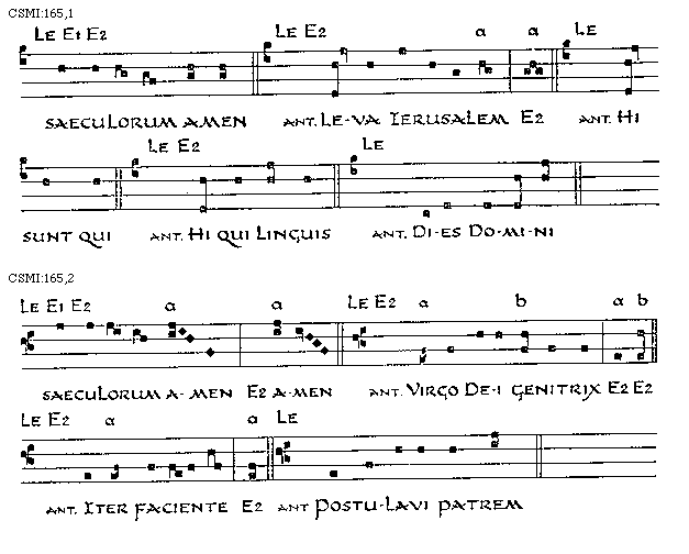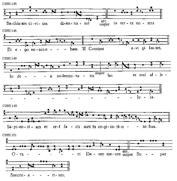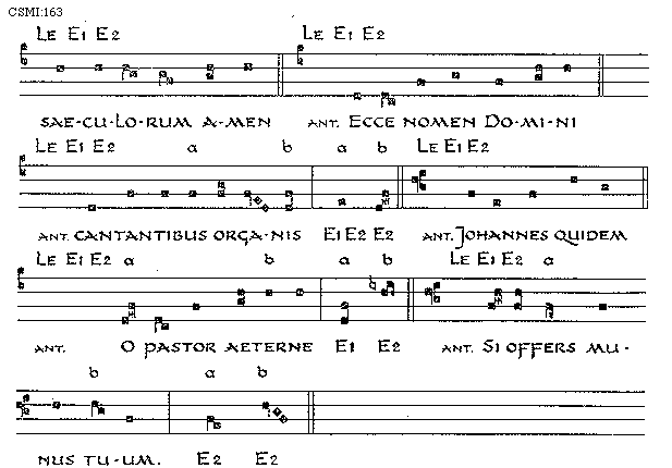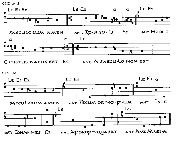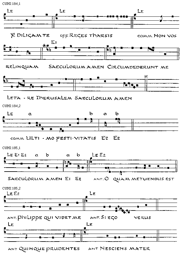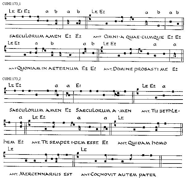 [CSMI:173,2; text: Le, E1, E2, a, Saeculorum amen, antiphona Tu Bethlehem, antiphona Te semper idem esse, antiphona Quidam homo, antiphona Mercennarius est, antiphona Cognovit autem pater]