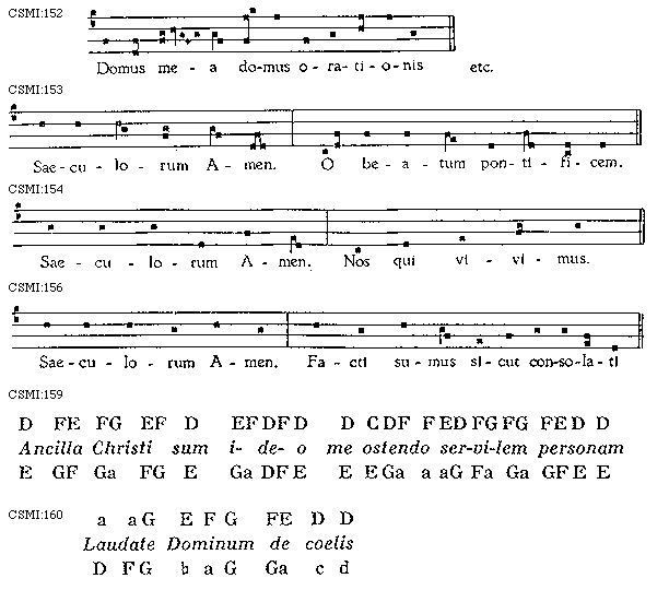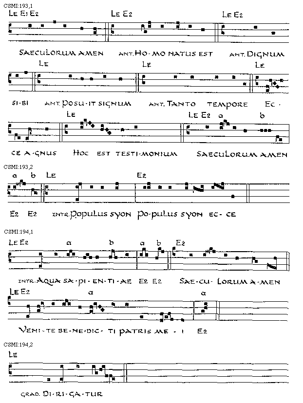 [193][CSMI:193; text: Le, E1, E2, a, b, Saeculorum amen, antiphona Homo natus est, antiphona Dignum sibi, antiphona Posuit signum, antiphona Tanto tempore, Ecce agnus, Hoc est testimonium, introitus Populus Syon, Populus Syon ecce]