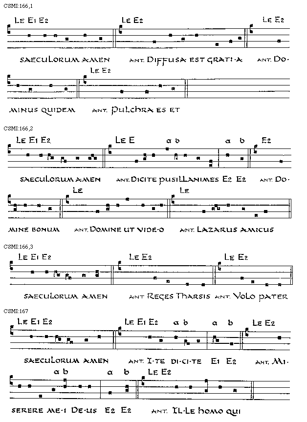 [CSMI:172; text: Le, E1, E2, a, saeculorum amen, ant Pudore bono, ant Qui de terra est, ant Haec est quae nescivit]