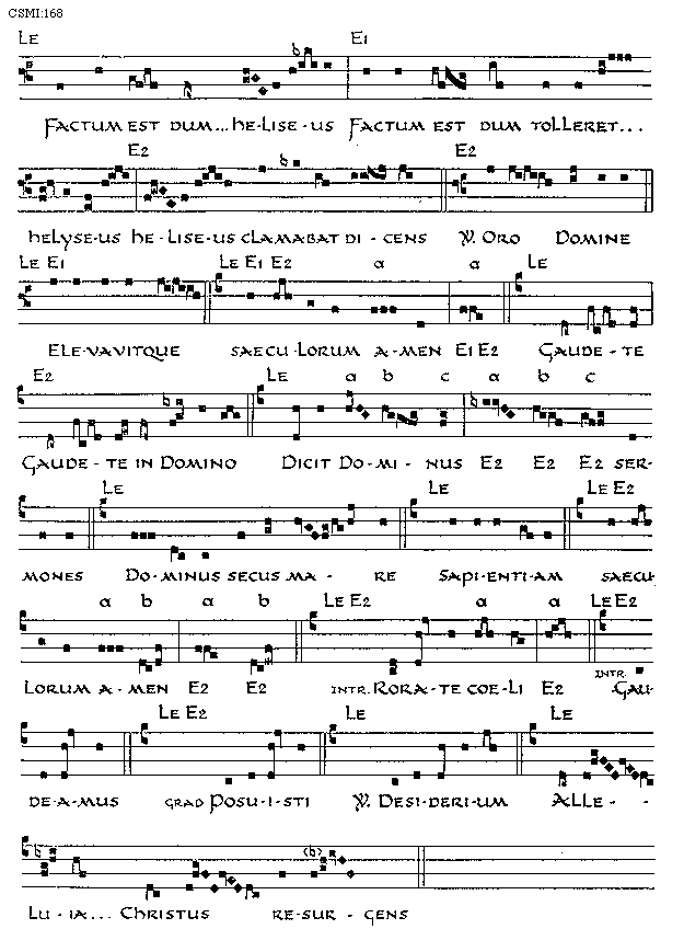 [168][CSMI:168; text: Le, E1, E2, a, b, c, Factum est dum...heliseus, Factum est dum tolleret...helyseus, heliseus clamabat dicens, Versus Oro Domine, Elevavitque, saeculorum amen, Gaudete, gaudete in Domino, Dicit Dominus sermones, Dominus secus mare, Sapientiam, saeculorum amen, introitus Rorate coeli, introitus Gaudeamus, graduale Posuisti, Versus Desiderium, Alleluia...Christus resurgens]