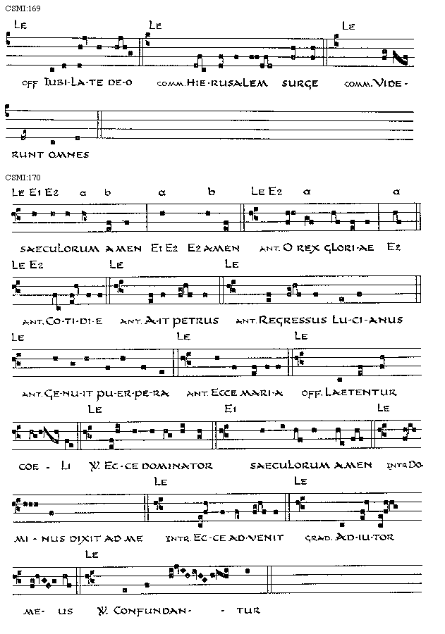 [170][CSMI:170; text: Le, E1, E2, a, b, saeculorum amen, amen, antiphona O rex gloriae, antiphona Cotidie, antiphona Ait Petrus, antiphona Regressus Lucianus, antiphona Genuit puerpera, antiphona Ecce Maria, offertorium Laetentur coeli, Versus Ecce dominator, saeculorum amen, intr Dominus dixit ad me, introitus Ecce advenit, graduale Adiutor meus, Versus Confundantur]