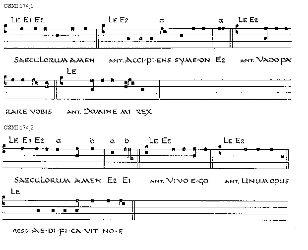 [CSMI:174,1; text: Le, E1, E2, a, Saeculorum amen, antiphona Accipiens Symeon, antiphona Vado parare vobis, antiphona Domine mi rex]