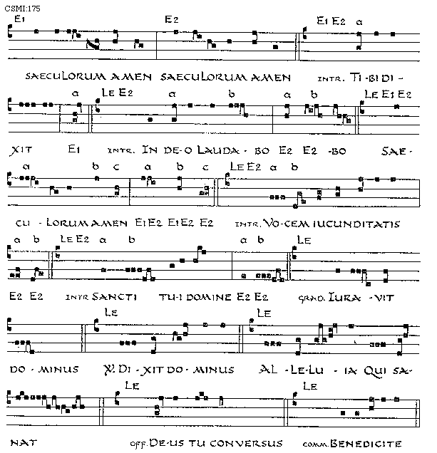[CSMI:175; text: Le, E1, E2, a, b, c, saeculorum amen, introitus Tibi dixit, introitus In Deo laudabo, introitus Vocem iucunditatis, intr Sancti tui Domine, graduale Iuravit Dominus, Versus Dixit Dominus, Alleluia qui sanat, offertorium Deus tu conversus, communio Benedicite]