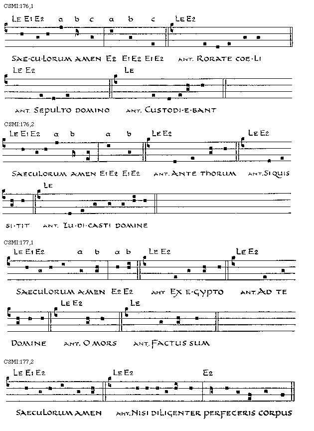 [CSMI:176,1; text: Le, E1, E2, a, b, c, Saeculorum amen, antiphona Rorate coeli, antiphona Sepulto Domino, antiphona Custodiebant]