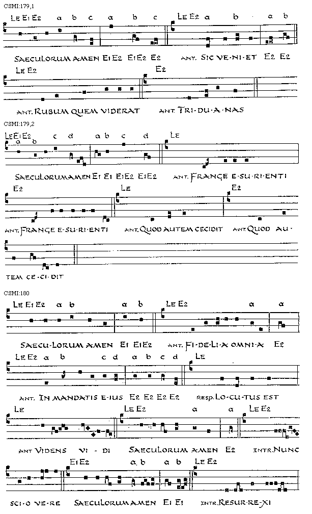 [179][CSMI:179,1; text: Le, E1, E2, a, b, c, Saeculorum amen, antiphona Sic veniet, antiphona Rubum quem viderat, antiphona Triduanas]